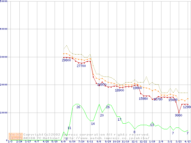 Socket A (Palomino,PGA,FSB 266MHz,L2 256KB)の最安値推移
