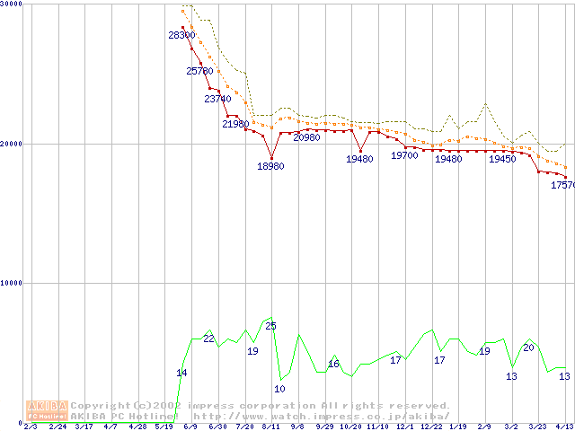 WD Caviar (7200rpm,UltraATA/100,2MB)の最安値推移