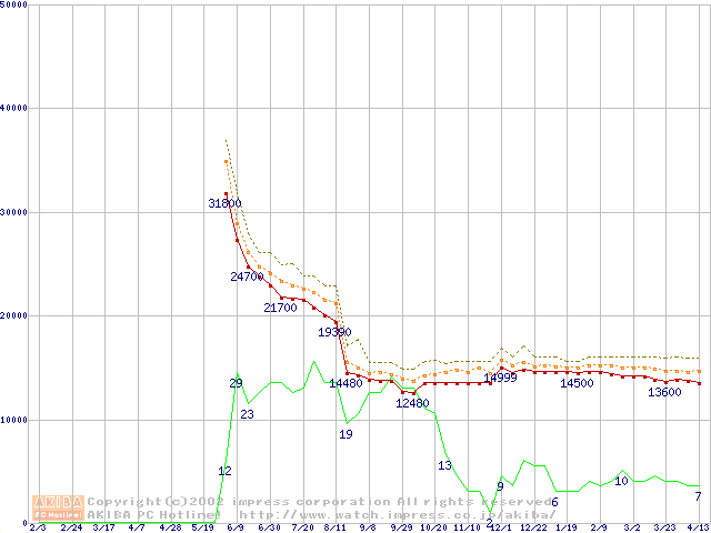 Socket A (Thunderbird,PGA,FSB 266MHz,L2 256KB)の最安値推移