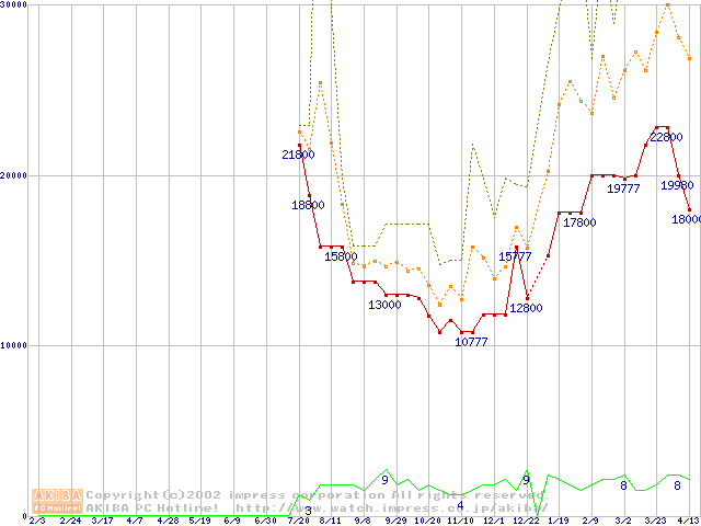 PC133 SDRAM DIMM CasLatency=3 ECC対応 Registeredタイプの最安値推移