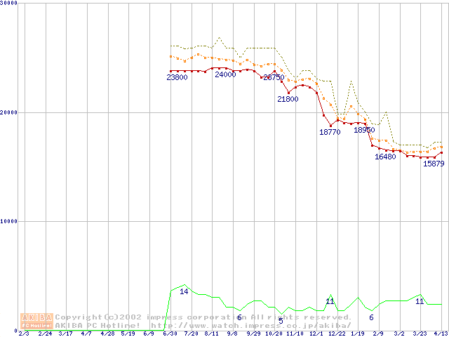 Socket 370 (FC-PGA2,FSB 133MHz,L2 256KB)の最安値推移