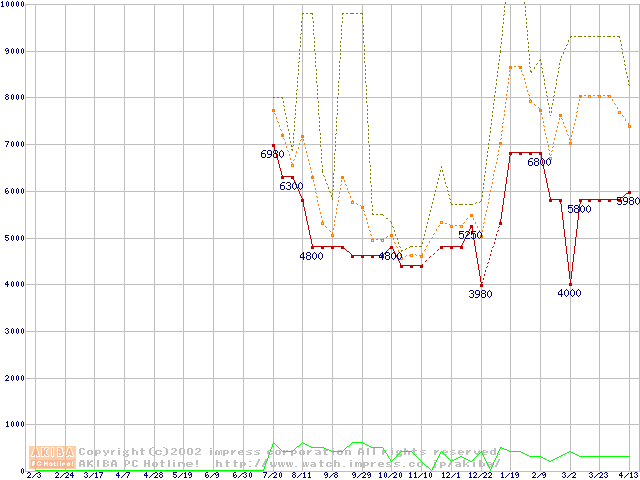 PC100 SDRAM DIMM CasLatency=2 ECC対応 Registeredタイプの最安値推移