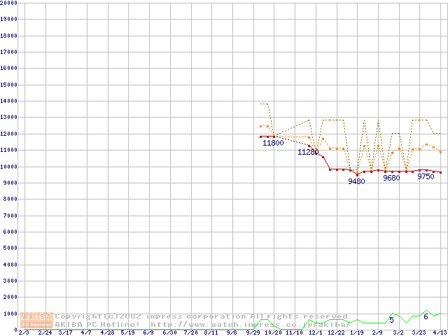 Travelstar 15GN (9.5mm,4200rpm,UltraATA/100,512KB,流体軸受)の最安値推移