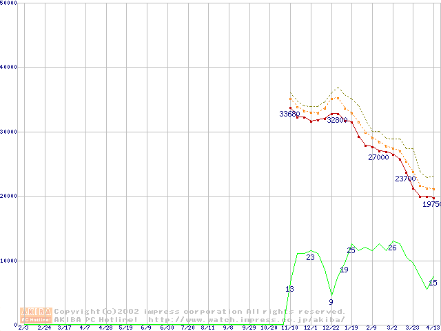 Socket A (Palomino,OPGA,FSB 266MHz,L2 256KB)の最安値推移