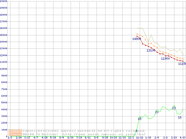 Travelstar 40GN (9.5mm,4200rpm,UltraATA/100,20GB/Platter,2MB,流体軸受)の最安値推移