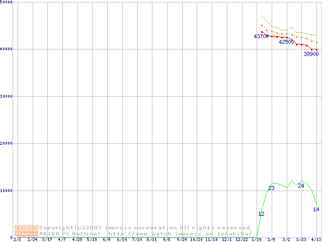 Socket 370 (FC-PGA2,FSB 133MHz,L2 512KB)の最安値推移