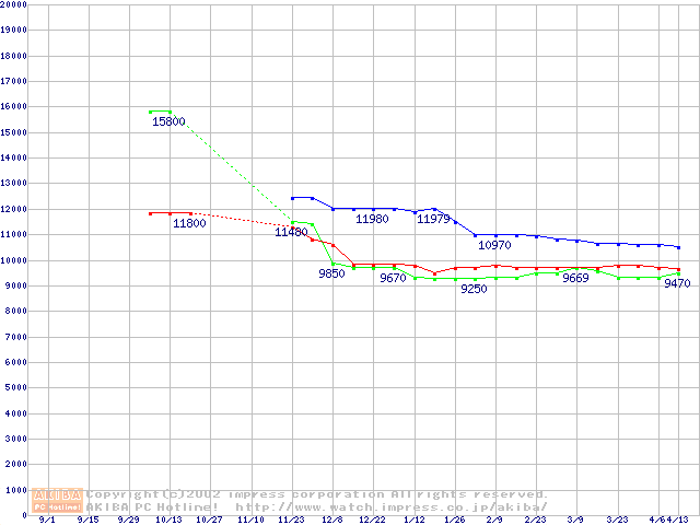 | [↑前グラフ]: | Travelstar 30GN (9.5mm,4200rpm,UltraATA/100,2MB,流体軸受)の最安値推移 |