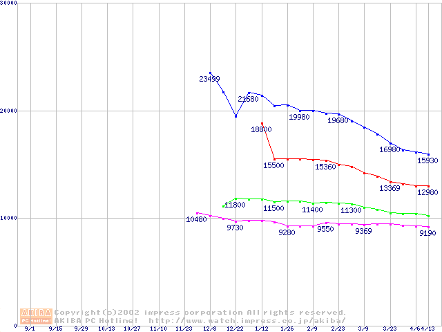 | [↑前グラフ]: | Deskstar 60GXP (7200rpm,UltraATA/100 2MB)の最安値推移 |
