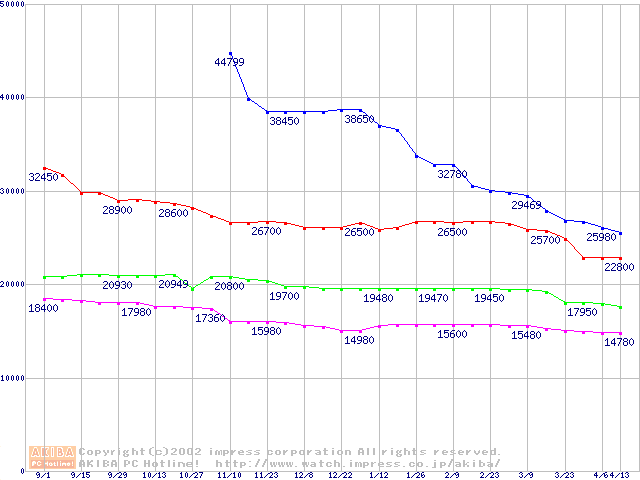 | [↓次グラフ]: | WD Caviar (7200rpm,UltraATA/100,20GB/Platter)の最安値推移 |