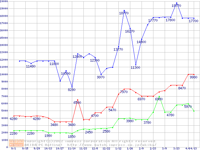 | [↑前グラフ]: | PC100 SDRAM DIMM CasLatency=2の最安値推移 |