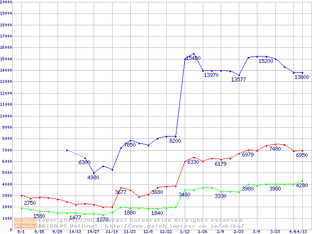 | [↓次グラフ]: | PC133 SDRAM DIMM CasLatency=3 ECC対応の最安値推移 |