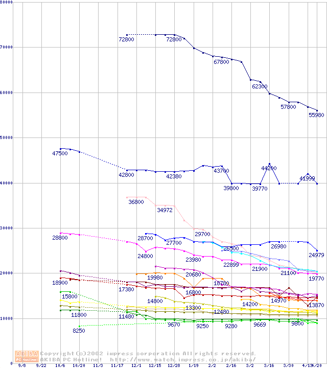2.5インチHDD主要製品(最安値1万円未満)の最安値推移