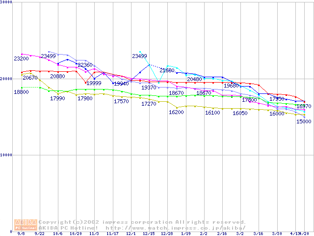 HDD主要製品(最安値1万5千円~2万円未満)の最安値推移