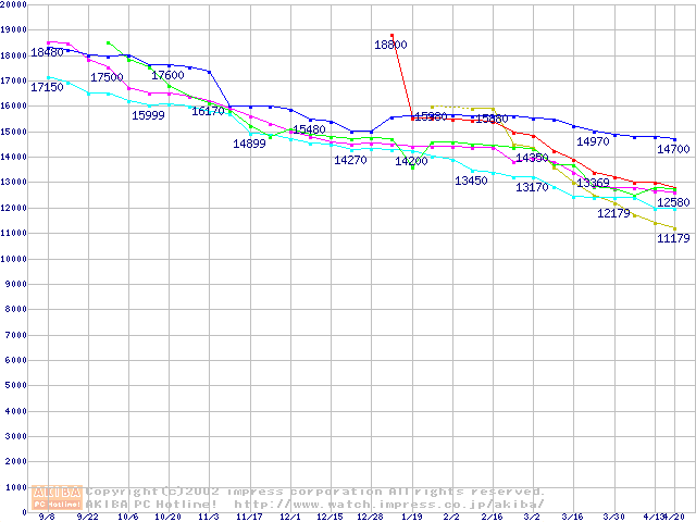 | [↑前グラフ]: | HDD 40GB~50GB未満(7200rpmクラス)の最安値推移 |