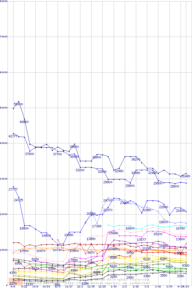 メモリ主要製品(最安値1万円以上)の最安値推移
