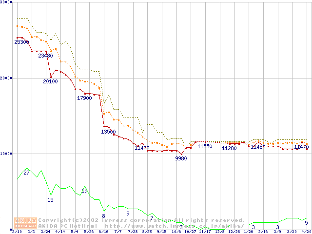 Socket A (Thunderbird,PGA,FSB 200MHz,L2 256KB)の最安値推移