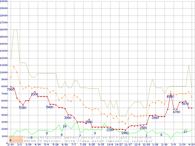 PC100 SDRAM DIMM CasLatency=2 ECC対応の最安値推移