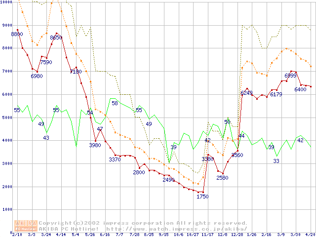 PC100 SDRAM DIMM CasLatency=2の最安値推移