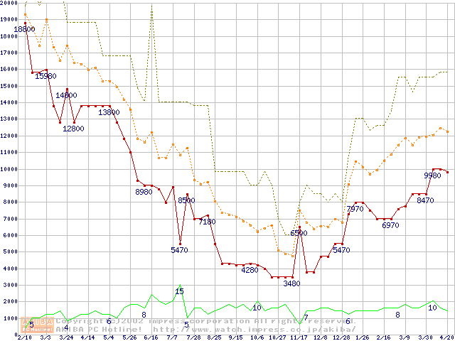 PC100 SDRAM DIMM CasLatency=2 ECC対応の最安値推移