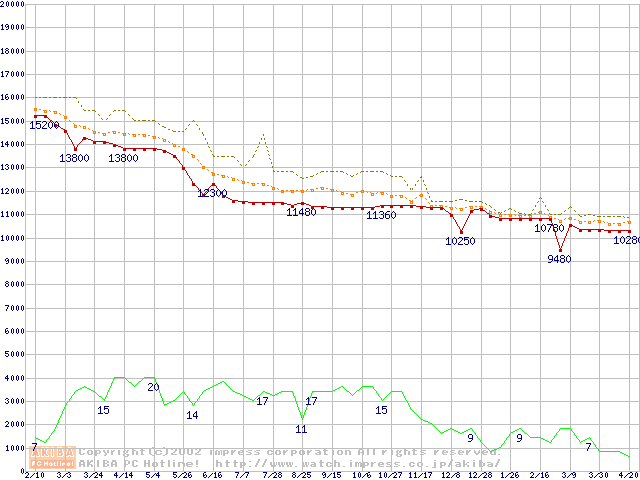 WD Caviar (7200rpm,UltraATA/100,20GB/Platter)の最安値推移