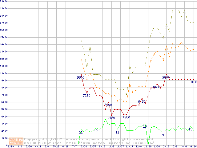 PC133 SDRAM DIMM CasLatency=3 ECC対応 Registeredタイプの最安値推移