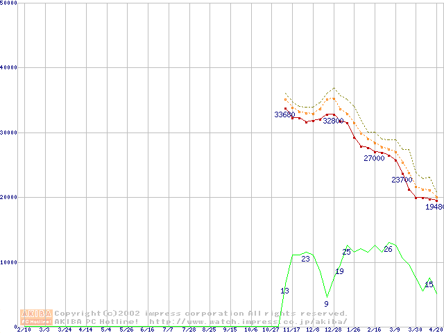 Socket A (Palomino,OPGA,FSB 266MHz,L2 256KB)の最安値推移