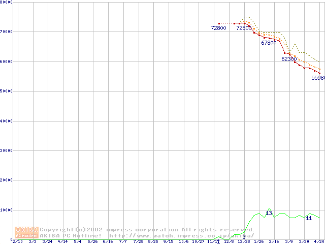 Travelstar 60GH (12.5mm,5400rpm,UltraATA/100,15GB/Platter,2MB,流体軸受)の最安値推移