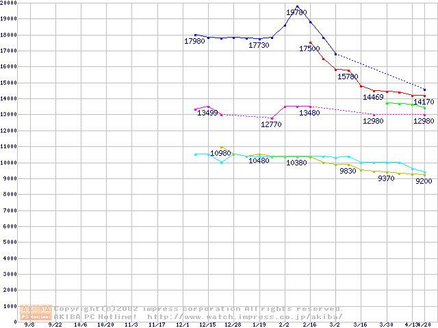 | [↓次グラフ]: | DiamondMax D540X (5400rpm,UltraATA/100,40GB/Platter)の最安値推移 |