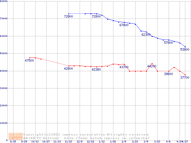 | [↑前グラフ]: | 2.5インチHDD主要製品(最安値2万円~3万円未満)の最安値推移 |