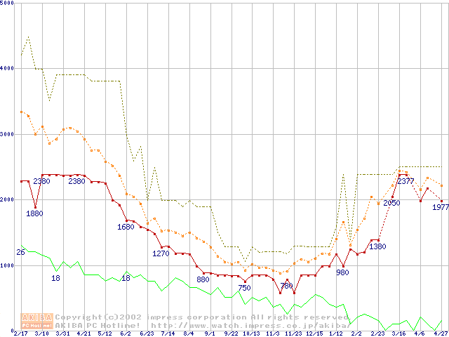 PC133 SDRAM DIMM CasLatency=3の最安値推移