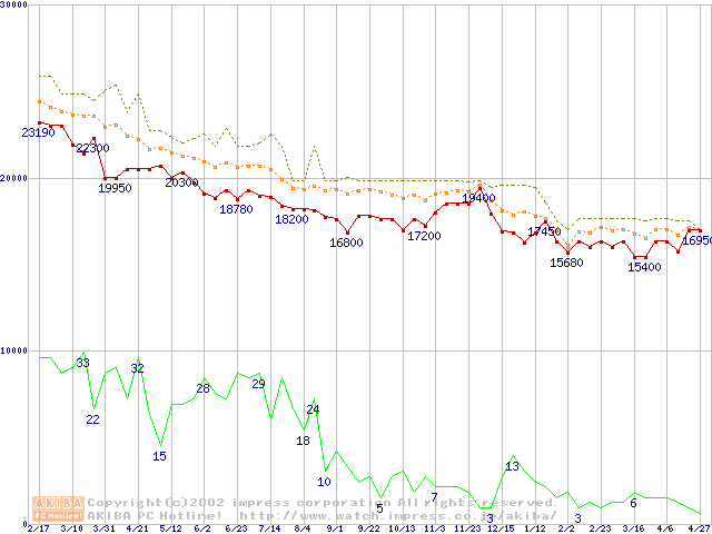 Socket 370 (FC-PGA,FSB 100MHz,L2 256KB)の最安値推移