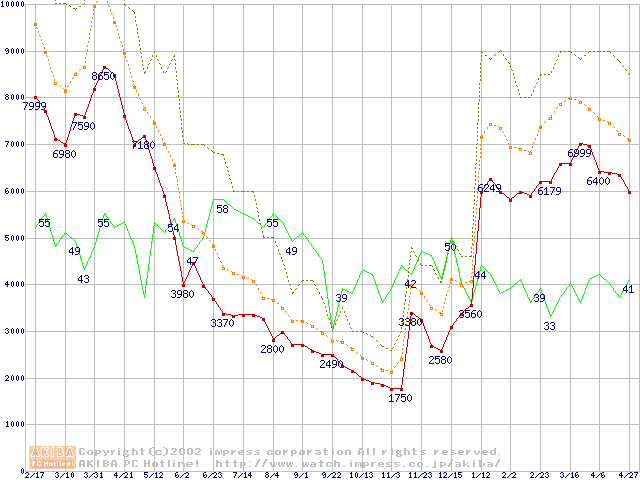 PC100 SDRAM DIMM CasLatency=2の最安値推移