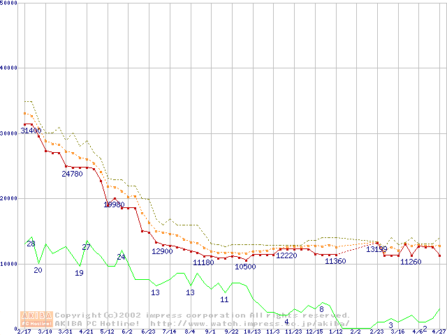 Socket A (Thunderbird,PGA,FSB 200MHz,L2 256KB)の最安値推移