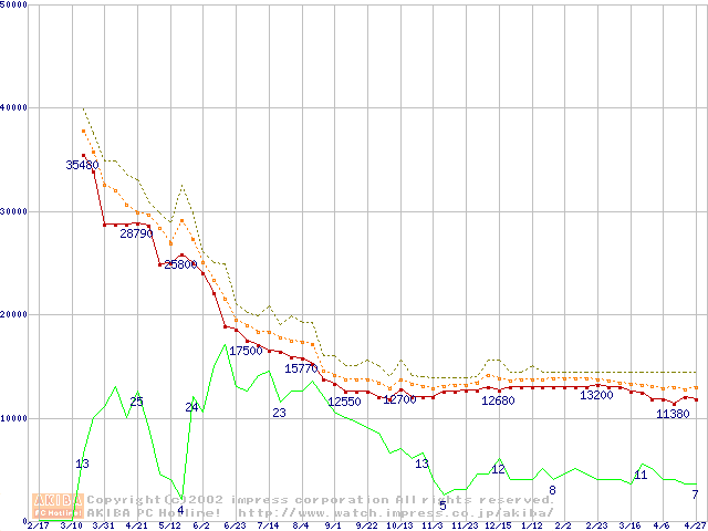 Socket A (Thunderbird,PGA,FSB 266MHz,L2 256KB)の最安値推移