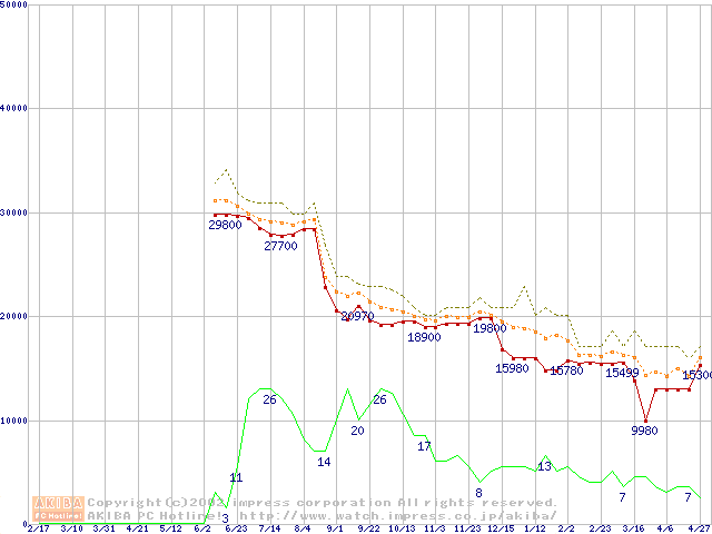 Socket A (Palomino,PGA,FSB 266MHz,L2 256KB)の最安値推移