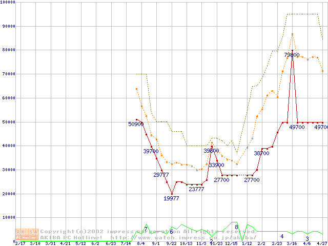 PC133 SDRAM DIMM CasLatency=3 ECC対応 Registeredタイプの最安値推移