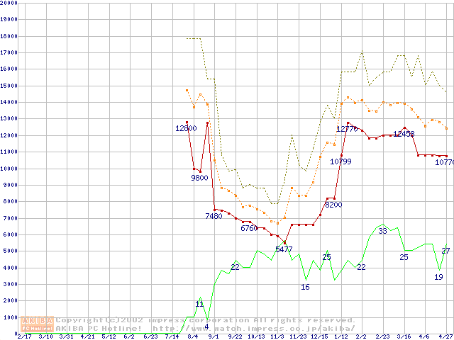 メモリ主要製品(最安値1万円以上)の最安値推移