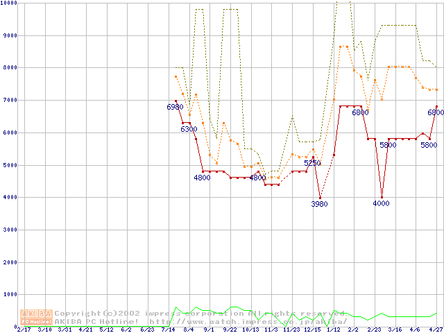 PC100 SDRAM DIMM CasLatency=2 ECC対応 Registeredタイプの最安値推移
