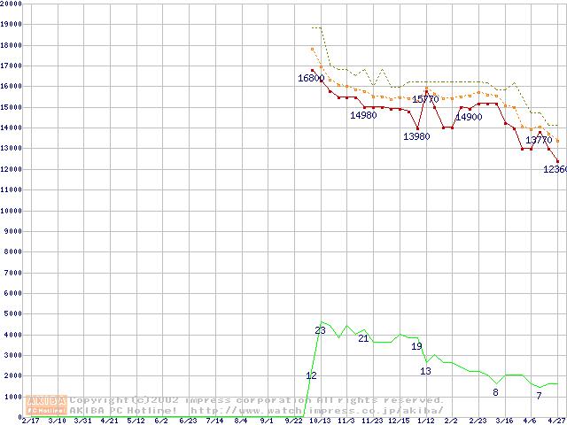 Socket A (Palomino,OPGA,FSB 266MHz,L2 256KB)の最安値推移