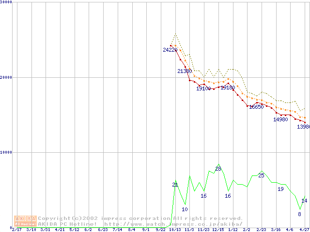 Socket A (Palomino,OPGA,FSB 266MHz,L2 256KB)の最安値推移