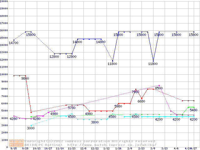 | [↑前グラフ]: | Socket A (Spitfire,PGA,FSB 200MHz,L2 64KB)の最安値推移 |
