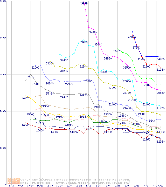 Socket A (Palomino,OPGA,FSB 266MHz,L2 256KB)の最安値推移