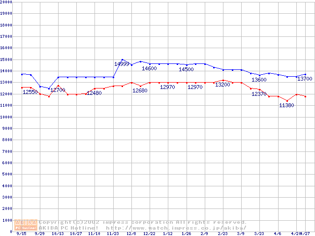 | [↓次グラフ]: | Socket A (Thunderbird,PGA,FSB 200MHz,L2 256KB)の最安値推移 |
