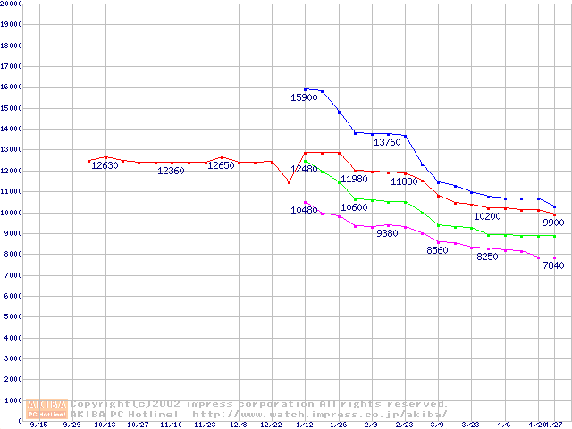 | Socket 370 (FC-PGA2,FSB 100MHz,L2 256KB)の最安値推移 |