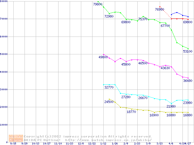 | [↑前グラフ]: | PC800 DRDRAM RIMM ECC対応の最安値推移 |