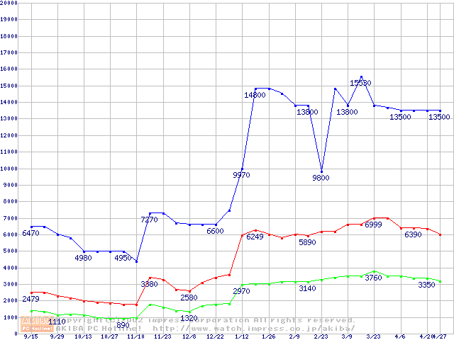 | [↑前グラフ]: | PC133 SDRAM DIMM CasLatency=3 ECC対応 Registeredタイプの最安値推移 |