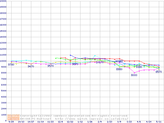| [↓次グラフ]: | HDD 60GB~80GB未満(5400rpmクラス)の最安値推移 |