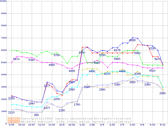 メモリ主要製品の最安値推移