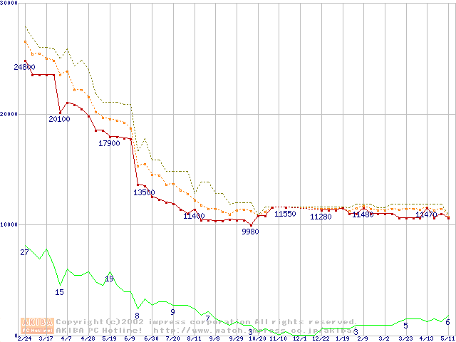 Socket A (Thunderbird,PGA,FSB 200MHz,L2 256KB)の最安値推移