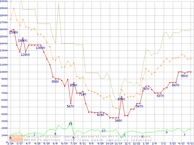 PC100 SDRAM DIMM CasLatency=2 ECC対応の最安値推移